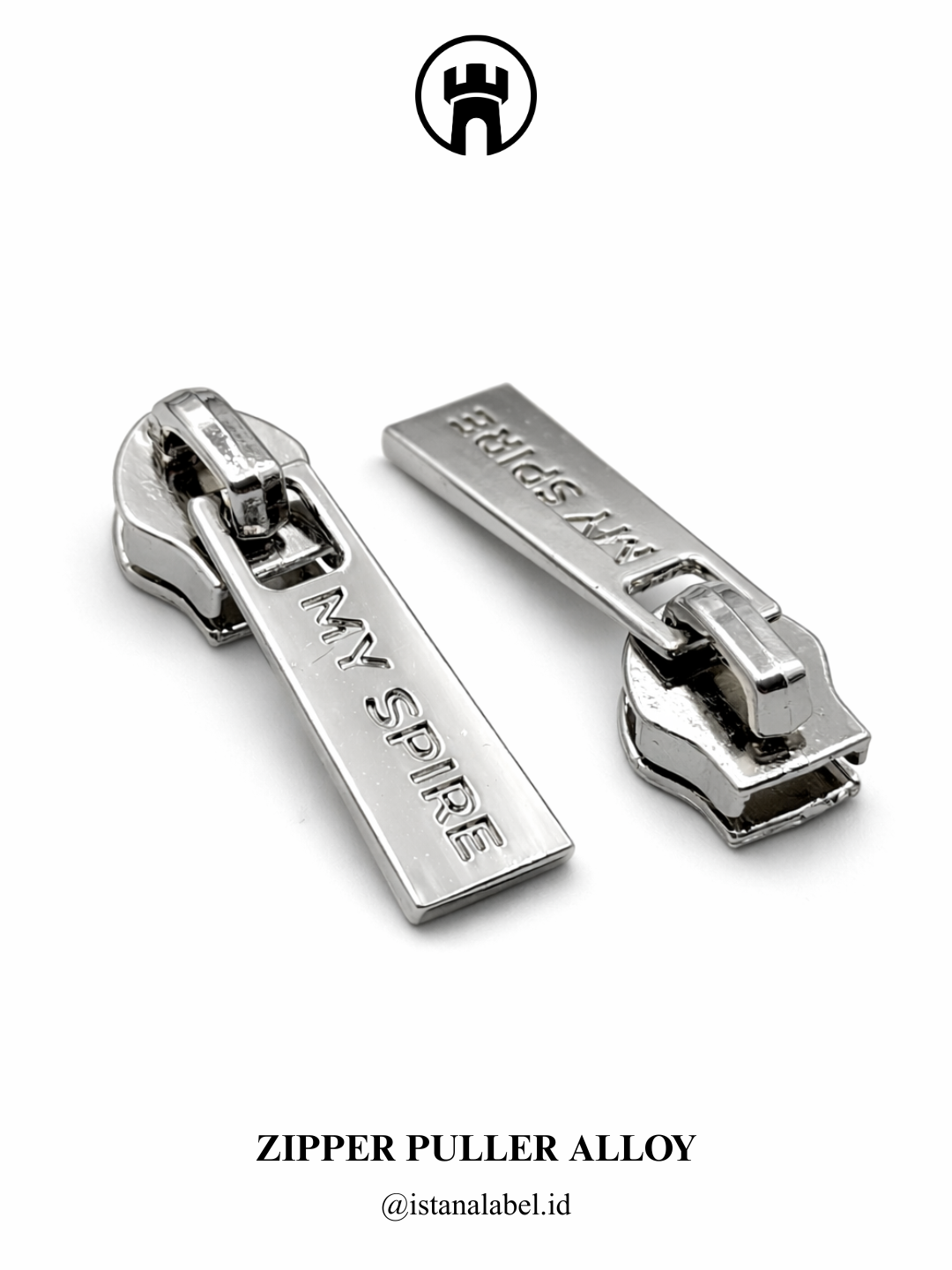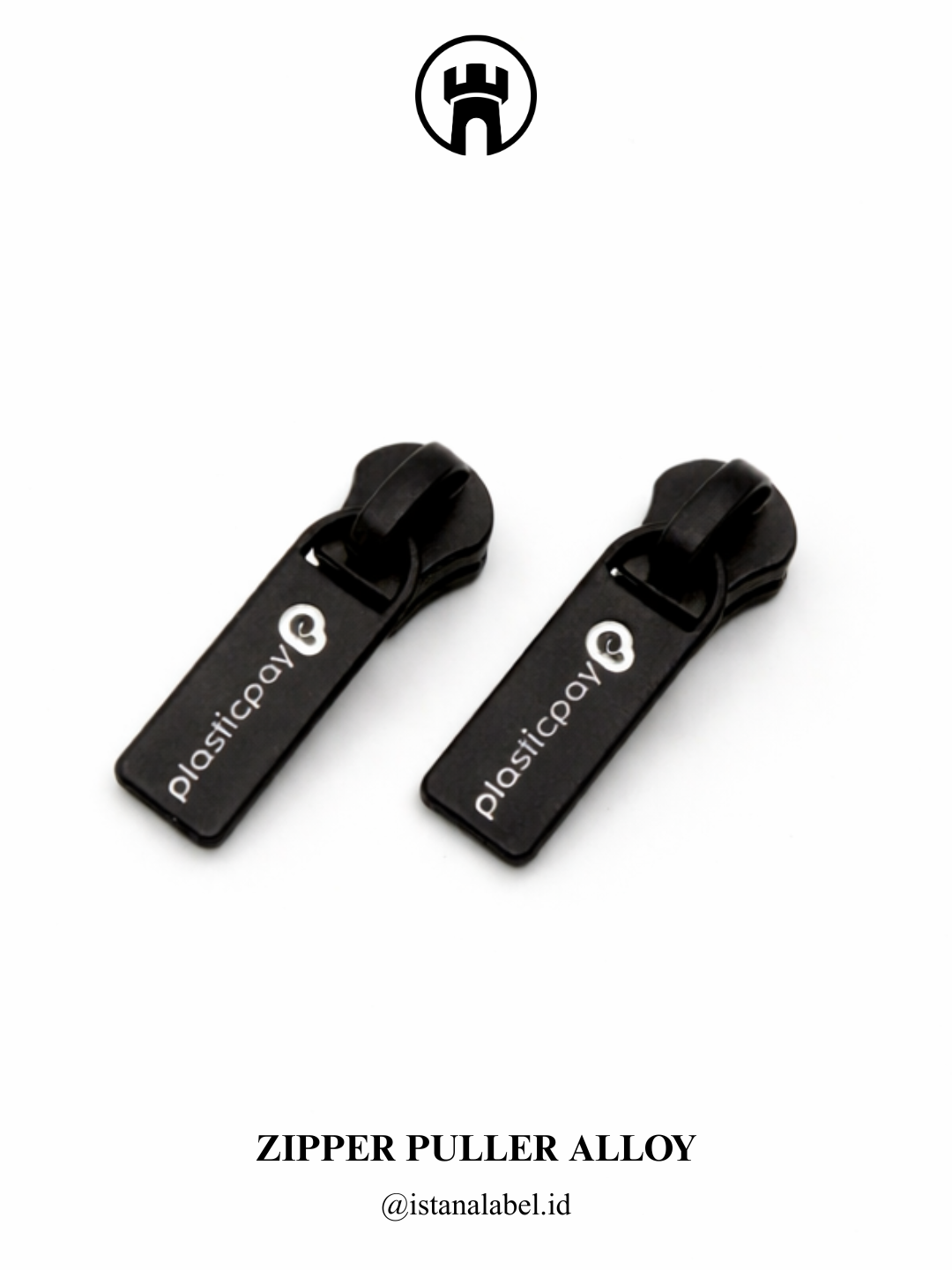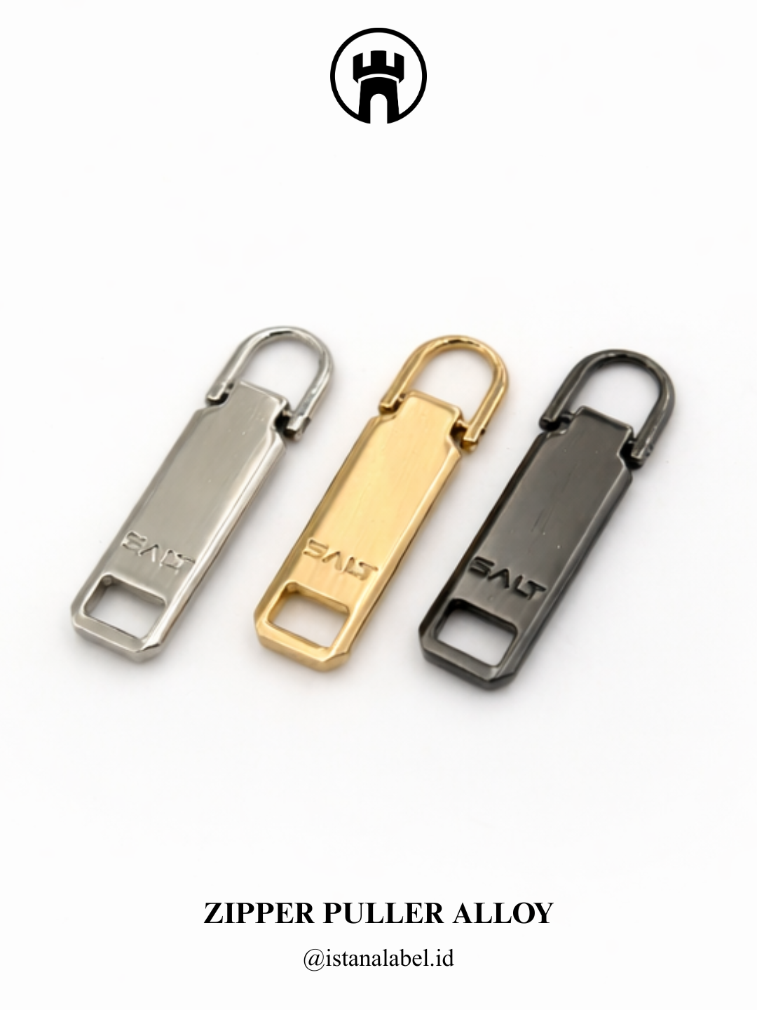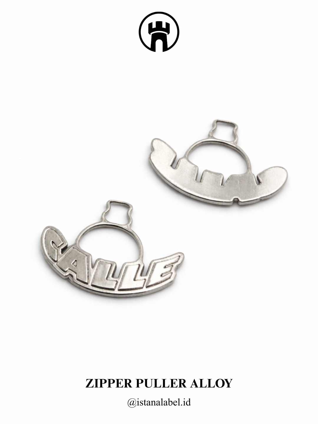 Zipper puller alloy premium dengan tampilan elegan dan kuat, menggunakan bahan campuran logam berkualitas yang tahan karat dan tidak mudah pudar, tersedia 96 pilihan warna serta bebas custom bentuk dan logo sesuai kebutuhan brand Anda untuk hasil yang lebih eksklusif.